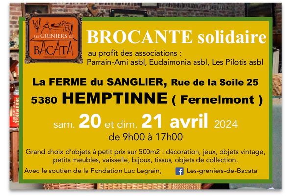 BROCANTE SOLIDAIRE au bénéfice des associations : Parrain-Ami asbl, Eudaimonia asbl et Les Pilotis asbl. Brocante semi couverte dans le superbe site de la Ferme du Sanglier à HEMPTINNE, Fernelmont. Des milliers d'objets joliment exposés sur plus de 500m2: décoration, vaisselle, jeux, objets vintage, petits meubles, bijoux, tissus, objets de collection, argenterie, curiosités... Suivez nous sur Facebook.