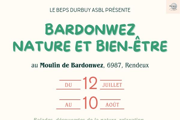 Chaque vendredi de 18h à 20h30 et chaque samedi de 14h à 16h30, Bardonwez (à Rendeux), son moulin et son arboretum accueilleront une séance de 2h30 comprenant 1 atelier/balade nature suivi par 1 atelier bien-être.