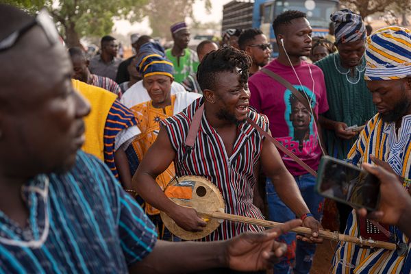 Le film sera suivi d’un concert de Stevo Atambire. Stevo est un musicien primé et connu comme le leader d’Alostmen. Neo-griot d’origine Frafra, il joue du Kologo comme nul autre. Guitare à deux cordes en calebasse et peau de chèvre, cet instrument est considéré comme le prédécesseur du banjo. Il émet des sons à la fois mélodiques et percussifs. Stevo est bien connu au Ghana. Sa voix, son jeu et ses messages l’ont rendu populaire parmi son peuple Frafra. C’est un musicien très prisé pour les cérémonies funéraires traditionnelles et les mariages.