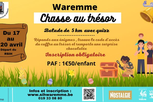 🚶🚶♀️Au long d'une balade de 5 km, répondez aux énigmes sur le patrimoine waremmien afin de trouver le coffre au trésor et le code du cadenas vous permettant d'obtenir une récompense chocolatée.