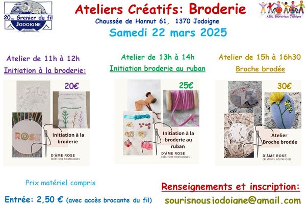 Envie de vous initier à la broderie traditionnelle ou à la broderie au ruban de façon ludique ? Ou envie de broder une jolie broche ? Cet atelier est pour vous. Il aura lieu le samedi 22 mars 2025 Chaussée de Hannut, Site de l’Athénée Royal salle côté cours, 1370 Jodoigne. Horaires de 11h à 13h et tarifs de 20 à 30€ selon l’atelier. L’entrée de 2,50€ vous donnera accès à la brocante du fil qui se déroule dans la même salle, une brocante couverte organisée au profit de l’ASBL SourisNous Jodoigne. Le ticket d’entrée pour permettra aussi de participer à la tombola dont le premier prix est une machine à coudre. Bar et petite restauration à votre disposition à des prix raisonnables. Parking aisé devant la salle. Inscrivez-vous dès maintenant via sourisnousjodoigne@gmail.com. Nombre de place limité.