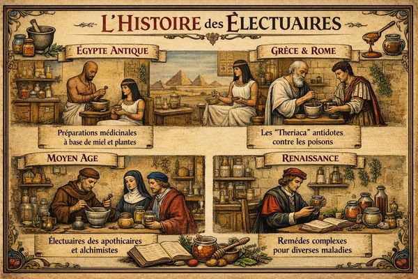 « Mithridate, roi du Pont, est célèbre pour avoir développé le mithridate, un électuaire polyvalent destiné à se prémunir contre les poisons. Cette tradition des mélanges médicinaux sucrés s'est perpétuée à travers les âges, depuis l'Égypte antique avec ses préparations à base de miel et de plantes, jusqu'à la Grèce et Rome avec les thériaques antidotes. Au Moyen Âge, apothicaires et alchimistes ont perfectionné ces élixirs, et à la Renaissance, des remèdes complexes étaient formulés pour traiter diverses maladies. Les électuaires illustrent ainsi l'évolution fascinante des remèdes sucrés à travers l'histoire. »