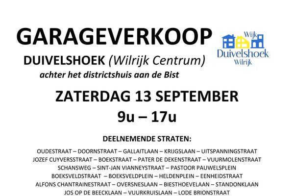 Kom op zaterdag 13 september eens snuffelen naar koopjes tijdens onze jaarlijkse GARAGEVERKOOP van wijk DUIVELSHOEK (WILRIJK Centrum), achter het districtshuis aan de Bist.
